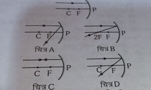 50. किसी अवतल दर्पण पर चित्र में दर्शाए अनुसार आपतित प्रकाश किरण के लिए निम्न आरेखों में में से कौन-सा सही है?