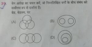 39. वेन आरेख का चयन करें, जो निम्नलिखित वर्गों के बीच संबंध को सर्वोत्तम रूप से दर्शाता है। बेड, बेडरूम, घर