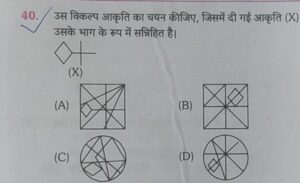 40. उस विकल्प आकृति का चयन कीजिए, जिसमें दी गई आकृति (X) उसके भाग के रूप में सन्निहित है।