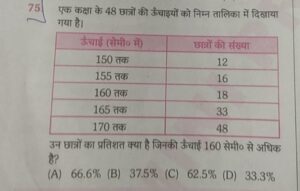 75. एक कक्षा के 48 छात्रों की ऊँचाइयों को निम्न तालिका में दिखाया गया है। उन छात्रों का प्रतिशत क्या है जिनकी ऊंचाई 160 सेमी० से अधिक है?